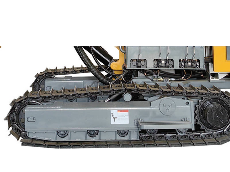 The surface DTH drilling rig is equipped with a Yuchai four-cylinder diesel engine and an integrated controller for real-time monitoring of drilling parameters. The rig adopts a reinforced folded crawler frame and heavy-duty undercarriage, with track leveling and a plunger-type feed motor to increase working pressure and improve climbing performance.